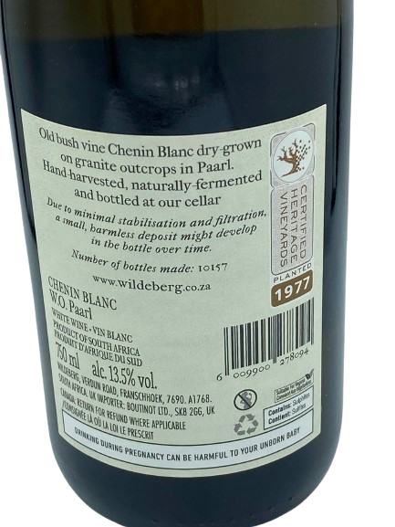 Wildeberg is een kleine wijnboerderij van 10 hectare in Franschhoek Zuid Afrika. Deze Chenin blanc druiven komen van de Single Vineyard die groeien op Smuts Block, een gebied met granietachtige bodem gelegen tussen de Tafelberg en Paarl. De wijngaard wordt volgens dry farming bewerkt, dat houdt in dat er niet geirrigeerd wordt. De druiven krijgen hierdoor een beetje waterstress, maar dit zorgt dat er meer concentratie en smaak gevormd wordt in de druif. De druiven worden geteeld aan Busch vines, met de hand geoogst en ondergaan een natuurlijke fermentatie. Vervolgens krijgt het sap een rijping van 12 maanden op gedeeltelijk oude en nieuwe franse vaten sur lie.